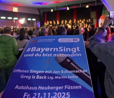 Das Autohaus Heuberger in Füssen verwandelte sich am vergangenen Wochenende in eine beeindruckende Klanghalle: Mehr als 350 Sängerinnen und Sänger folgten der Einladung zu #BayernSingt und füllten die außergewöhnliche Location mit Kraft, Gefühl und musikalischer Begeisterung. Die enorme Nachfrage im Vorfeld ließ bereits erahnen, dass das Mitsingkonzert zu einem besonderen Höhepunkt werden würde – und die Erwartungen wurden noch übertroffen.