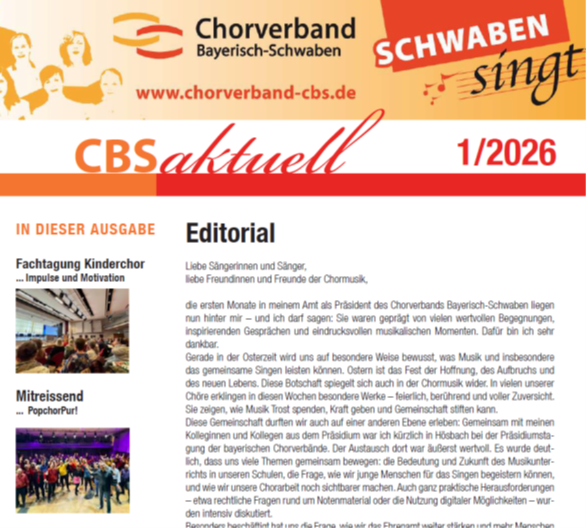 Die neueste Ausgabe des CBSaktuell 01/2026, mit Mitgliederzeitschrift des Chorverbands Bayerisch-Schwaben ist online.