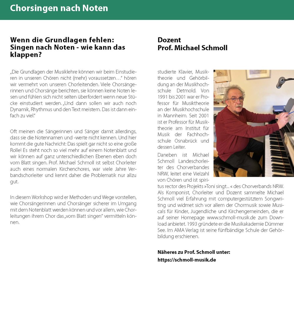 Daneben ist Michael Schmoll Landeschorleiter des Chorverbandes NRW, leitet eine Vielzahl von Chören und ist spiritus rector des Projekts »Toni singt... « des Chorverbands NRW. Als Komponist, Chorleiter und Dozent sammelte Michael Schmoll viel Erfahrung mit computergestütztem Songwriting und widmet sich vor allem der Chormusik sowie Musicals für Kinder, Jugendliche und Kirchengemeinden, die er auf seiner Homepage www.schmoll-musik.de zum Download anbietet. 1993 gründete er die Musikakademie Dümmer See. Im AMA Verlag ist seine fünfbändige Schule der Gehörbildung erschienen.