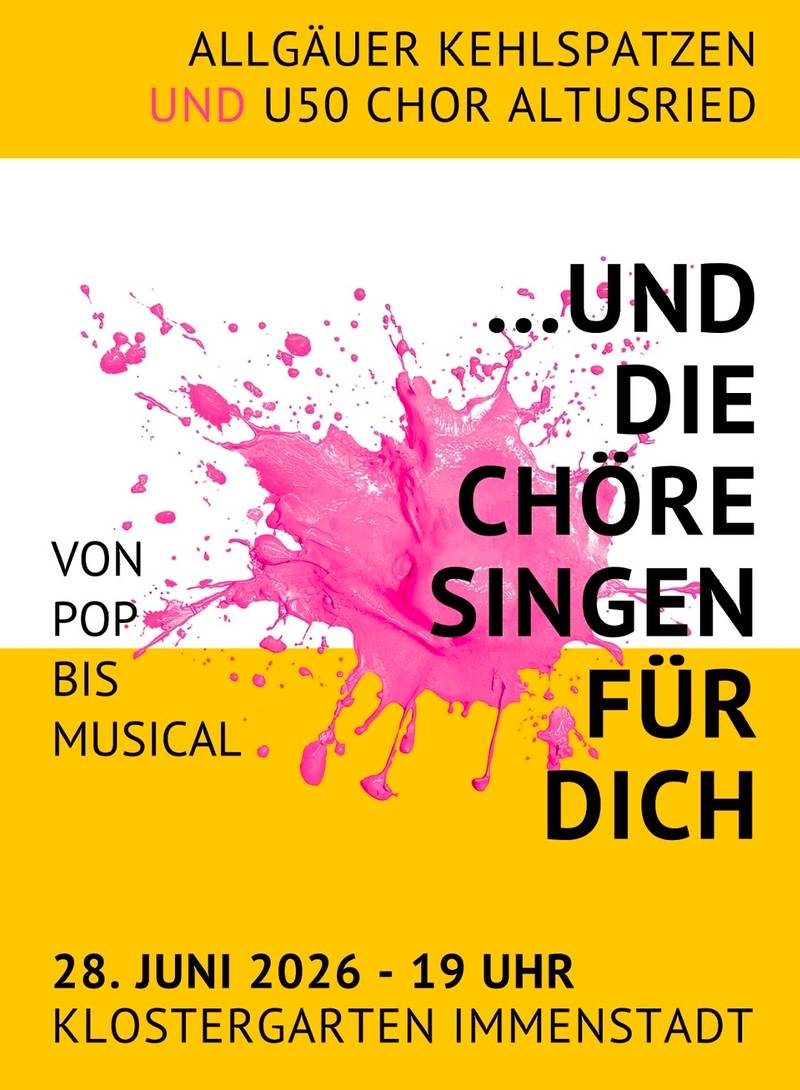 Und die Chöre singen für Dich 28.06.2026 19:00 Uhr Klostergarten Immenstadt Chor: Allgäuer Kehlspatzen und U50 Chor Altusried Mehr lesen