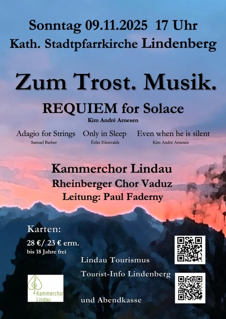 Der Kammerchor Lindau lädt am Sonntag, 9.11. um 17 Uhr zu seinem großen Herbstkonzert in die Pfarrkirche St. Peter und Paul in Lindenberg ein. Gemeinsam mit dem Rheinberger Chor Vaduz führt der Kammerchor unter der Leitung von Paul Faderny ein Programm zeitgenössischer Musik auf, das das Publikum in schwieriger Zeit zur Ruhe kommen lassen und trösten soll.