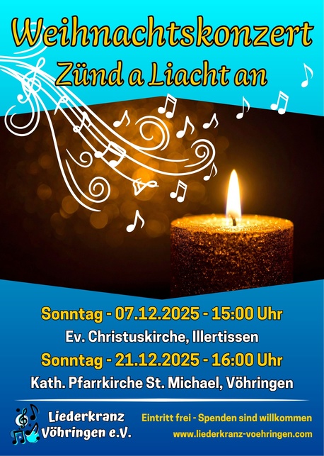 Der Liederkranz Vöhringen e. V. freut sich auf zahlreiche Besucherinnen und Besucher, die sich gemeinsam mit dem Chor musikalisch auf das Weihnachtsfest einstimmen möchten.