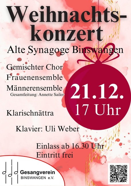 Der Gesangverein Binswangen lädt zum Weihnachtskonzert in die Alte Synagoge ein.
