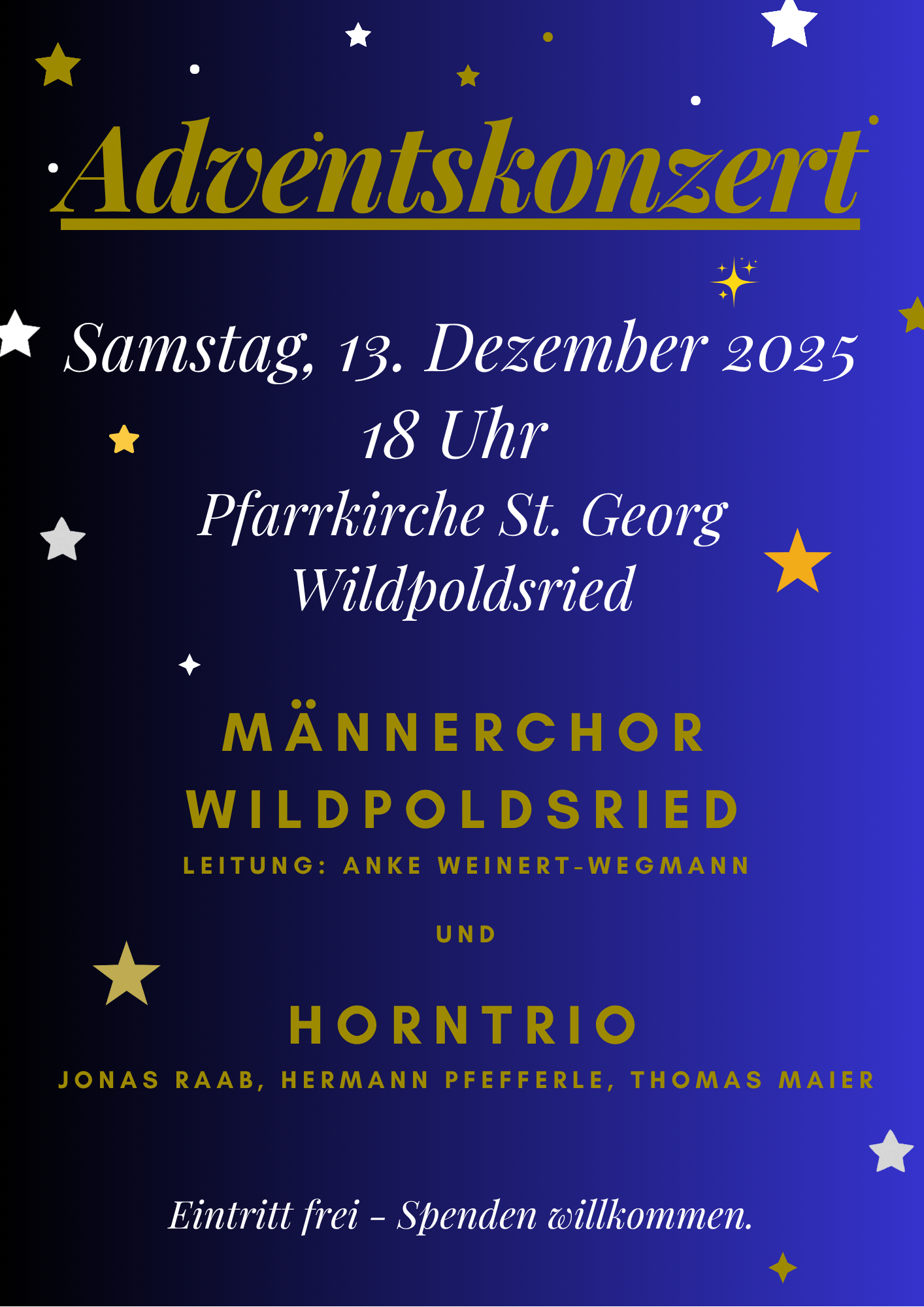 Der Männerchor Wildpoldsried (Ltg. Anke Weinert-Wegmann) und das Horntrio (Einstudierung Ulrich Köbl) laden herzlich ein zu einer besinnlichen Stunde mit weihnachtlichen Klängen.