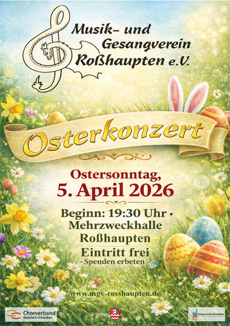 Wir laden Sie zu unseren traditionellen Osterkonzert nach Roßhaupten ein. Christoph Kaufmann mit dem Männerchor und gemischten Chor und Petra Jaumann-Bader mit dem Kinderchor haben wieder ein buntes Programm eingeübt, mit dem wir Ihnen den beginnenden Frühling noch etwas mehr versüßen möchten.