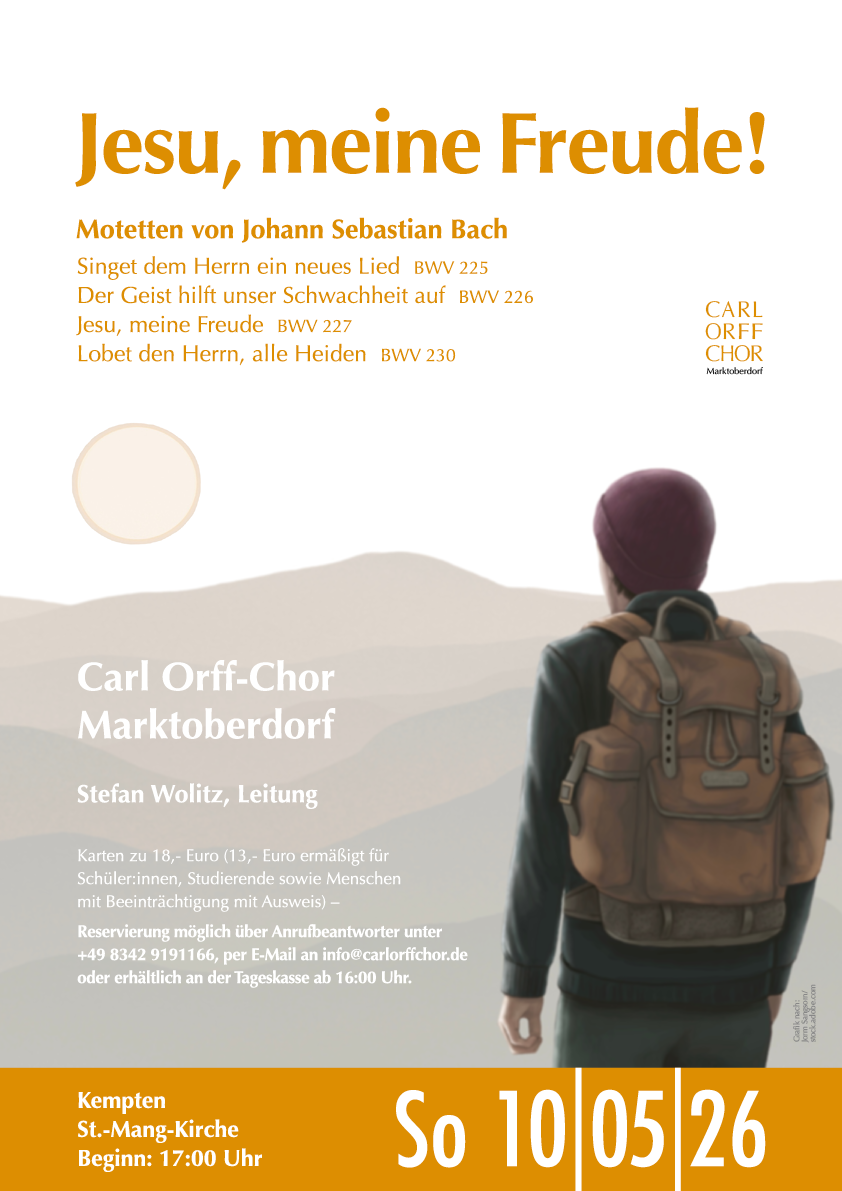 Am Sonntag, den 10. Mai 2026, lädt der Carl Orff-Chor Marktoberdorf um 17:00 Uhr in die St.-Mang-Kirche in Kempten zu einem besonderen Chorkonzert ein. Unter dem Titel »Jesu, meine Freude!« stehen vier der bedeutendsten Motetten von Johann Sebastian Bach auf dem Programm: »Singet dem Herrn ein neues Lied« (BWV 225), »Der Geist hilft unser Schwachheit auf« (BWV 226), »Lobet den Herrn, alle Heiden« (BWV 230) sowie die wohl bekannteste Bach-Motette »Jesu, meine Freude« (BWV 228). Die musikalische Gesamtleitung liegt in den Händen von Stefan Wolitz. Das Konzert verspricht ein intensives musikalisches Erlebnis – eine Einladung, Bach neu zu entdecken und seine zeitlose Musik in ihrer ganzen Tiefe zu erleben.