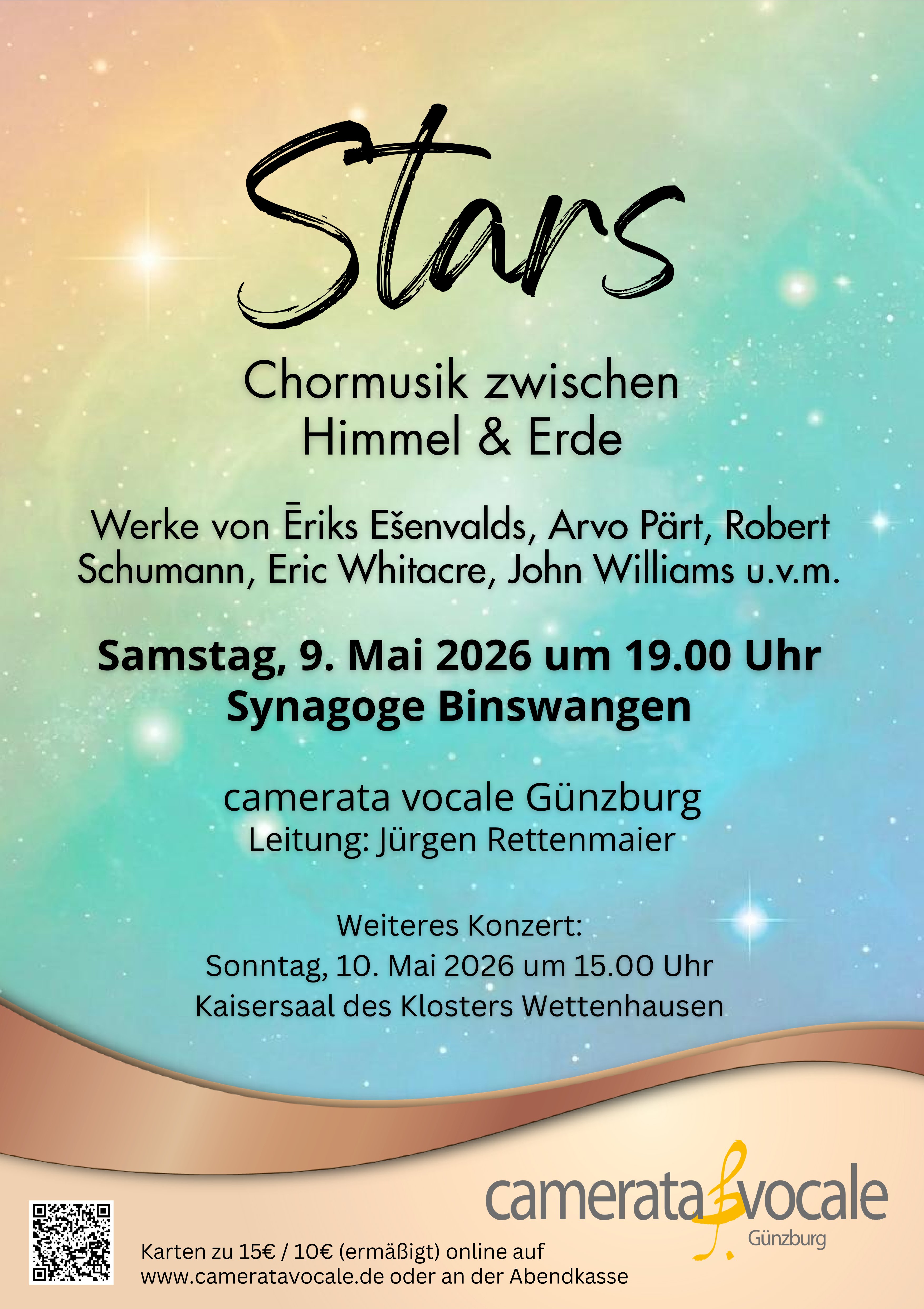 Was ist ein Star? Ein leuchtender Himmelskörper, ein Vogel mit schillerndem Gefieder, ein Idol der Bühne oder ein stiller Orientierungspunkt am Morgenhimmel? Das von Chorleiter Jürgen Rettenmaier sorgsam ausgewählte Konzertprogramm geht dieser Frage musikalisch nach und spannt einen weiten Bogen von zeitgenössischer Chormusik bis zu romantischen und populären Klangwelten.