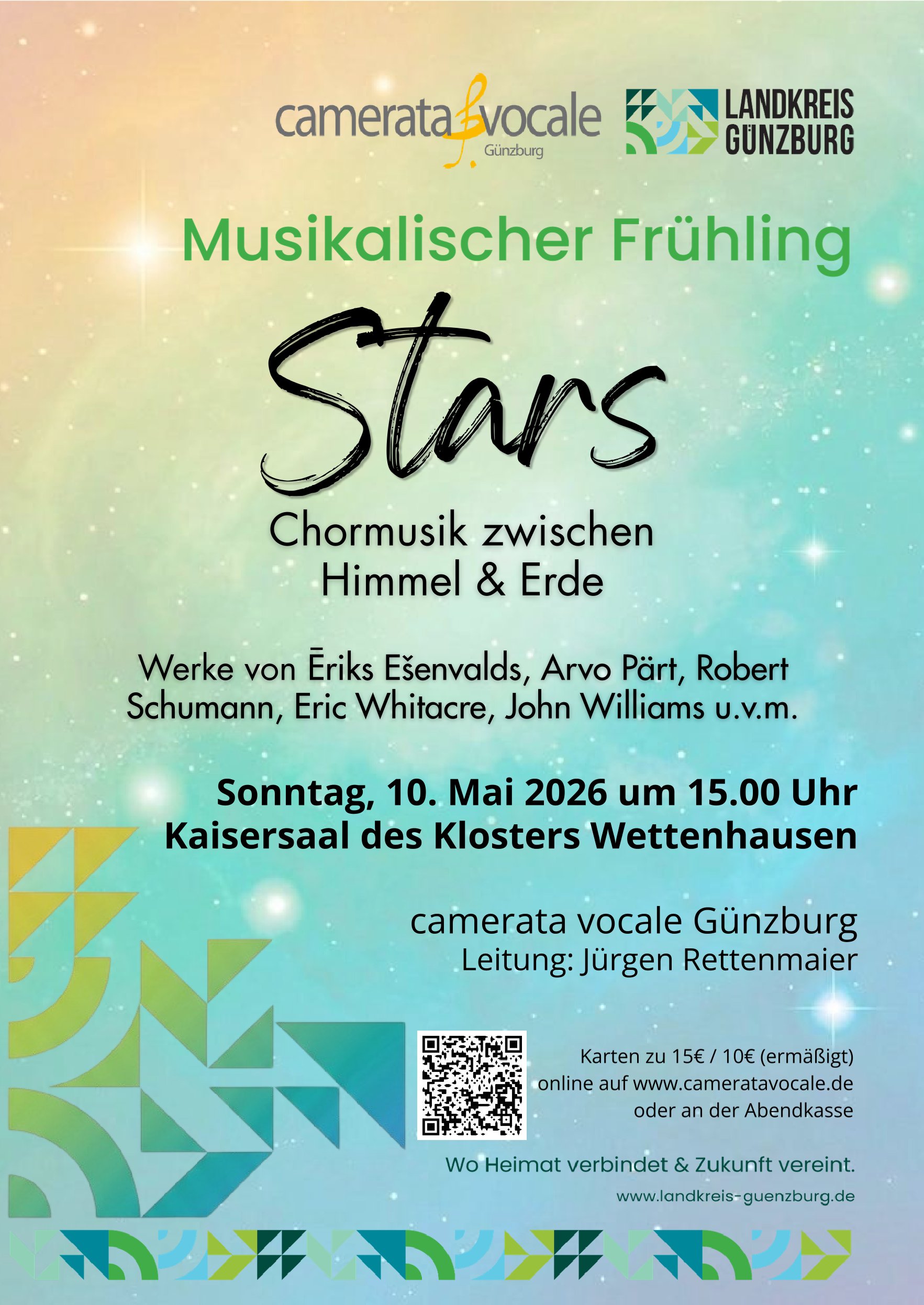 Was ist ein Star? Ein leuchtender Himmelskörper, ein Vogel mit schillerndem Gefieder, ein Idol der Bühne oder ein stiller Orientierungspunkt am Morgenhimmel? Das von Chorleiter Jürgen Rettenmaier sorgsam ausgewählte Konzertprogramm geht dieser Frage musikalisch nach und spannt einen weiten Bogen von zeitgenössischer Chormusik bis zu romantischen und populären Klangwelten.